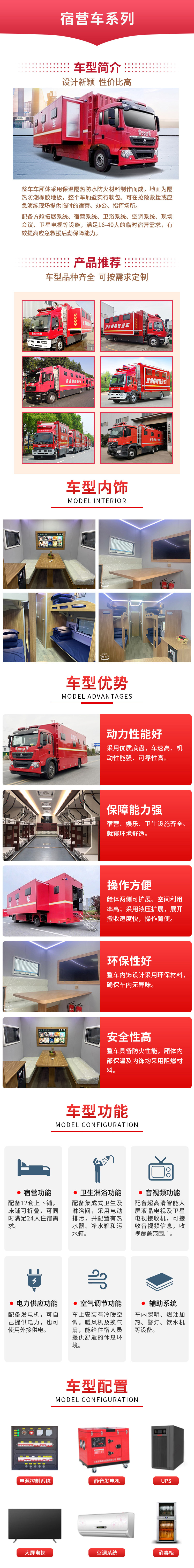 底盘配置:主要由重汽HOWO高端二类底盘ZZ1257N4347E1,重汽340马力国五发动机,,宿营方舱收拢外形尺寸(L×W×H):7350mm×2500mm×2377mm,宿营方舱展开外形尺寸(L×W×H):7350mm×4653mm×2377mm,**时速80公里每小时,总质量25吨,车重21.25吨载重3.6吨,外形尺寸mm:10900×2550×4000,重汽10档变速箱,abs、行车记录仪、方向助力、断气刹、12.00R20钢丝胎,上装配置:扩展宿营方舱、豪华折叠床、液晶电视、储物柜、应急灯、顶灯、顶置空调、床垫、被褥、燃油加热器、顶护栏、爬梯、隐藏抽拉梯、专用房车门、中空玻璃、户外灯,可实现28人野外住宿、洗漱和会议的功能。适合长期野外施工、救护、勘探、公路养护等工作。该车型有效解决全卧铺车载客量小、全座位车不便于休息的矛盾,很好的满足****系统的客户需求,提升了输送及宿营的舒适度。官兵远离营区执行抗洪抢险等野外任务,普通载客车不能满足宿营需要,针对特殊行业定制开发的宿营车,集人员输送和休息为一体。